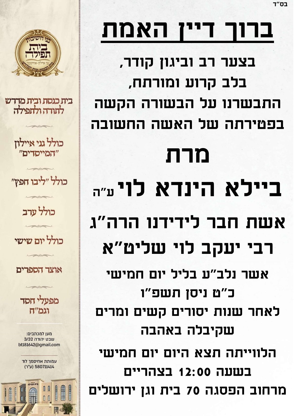 אבל באחיסמך על פטירתה לאחר מחלה קשה, של האשה מרת בילה לוי ע"ה מסע הלויה יצא בשעה 12 רח' הפסגה 70 בית וגן ירושלים.